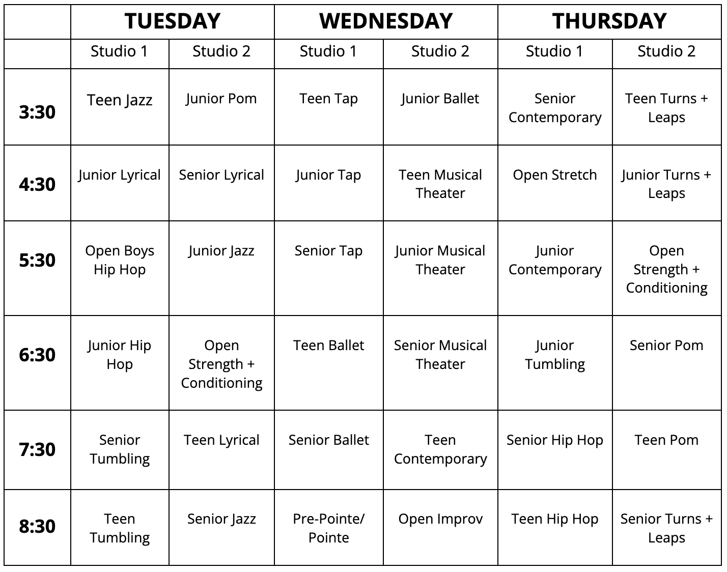 Total Flexibility: Classes run Tuesday, Wednesday, and Thursday from 3:30pm – 9:30pm.